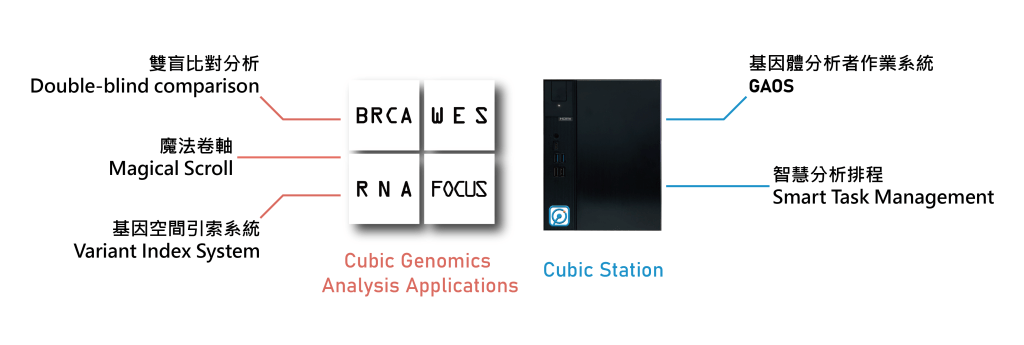 陽明交通大學生資團隊累積二十年無數次基因體數據分析相容測試及實作經驗,不斷校調及最佳化,建立一套輕量化的生物資訊分析環境(基因體分析者作業系統,GAOS),本公司獨家取得GAOS授權,搭載在立方工作站(Cubic Station)中。這套系統可以在小型工作站上運行原本只能在大型運算伺服器執行的基因體分析,並且可以執行大部份常見的DNA、RNA、微生物的基因分析流程。並且提供了方便的視覺化操作介面,是分析者進入基因體學最佳敲門磚。